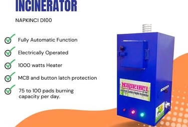 Our sanitary napkin incinerators, models D50, D100, and D300, offer efficient and safe disposal solutions. Each model is named after its burning capacity.